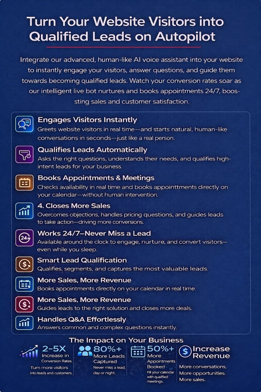 More conversations. More qualified leads. More sales. Visitors engage immediately and feel guided instead of abandoned. Your website doesn't just exist — it sells for you 24/7.